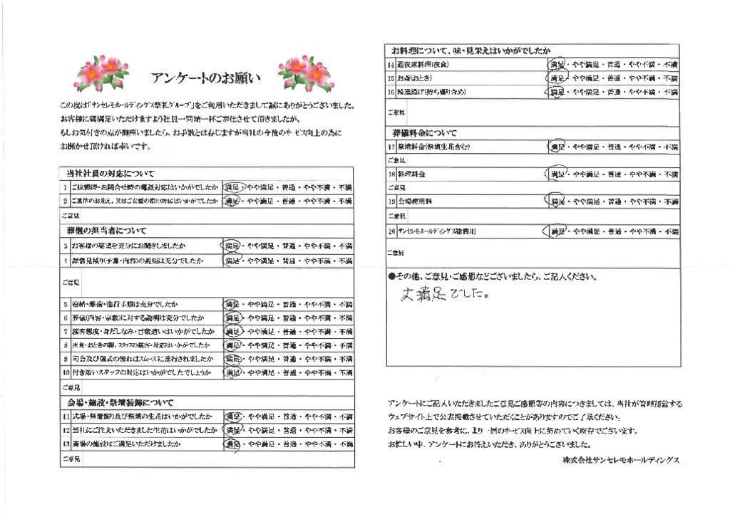 八女祭礼玉泉院でご葬儀をされたご家族様からのお声です。すべて満足との評価をいただき、誠にありがとうございます。